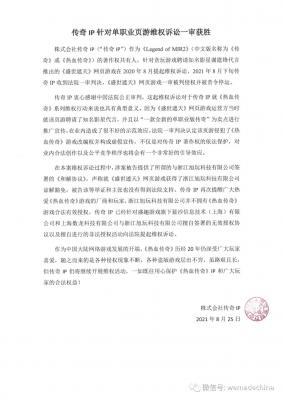 202109-15株式会社传奇IP(“传奇IP”)作为《Legendof MIR2》(中文版名称为《传奇》或《热血传奇》)的著作权共有人,针对贪玩游戏聘请知名影星谢霆锋代言推出的...